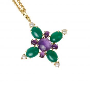 Amethyst and Green Onyx Pendant, four cultured pearls at the end of each side