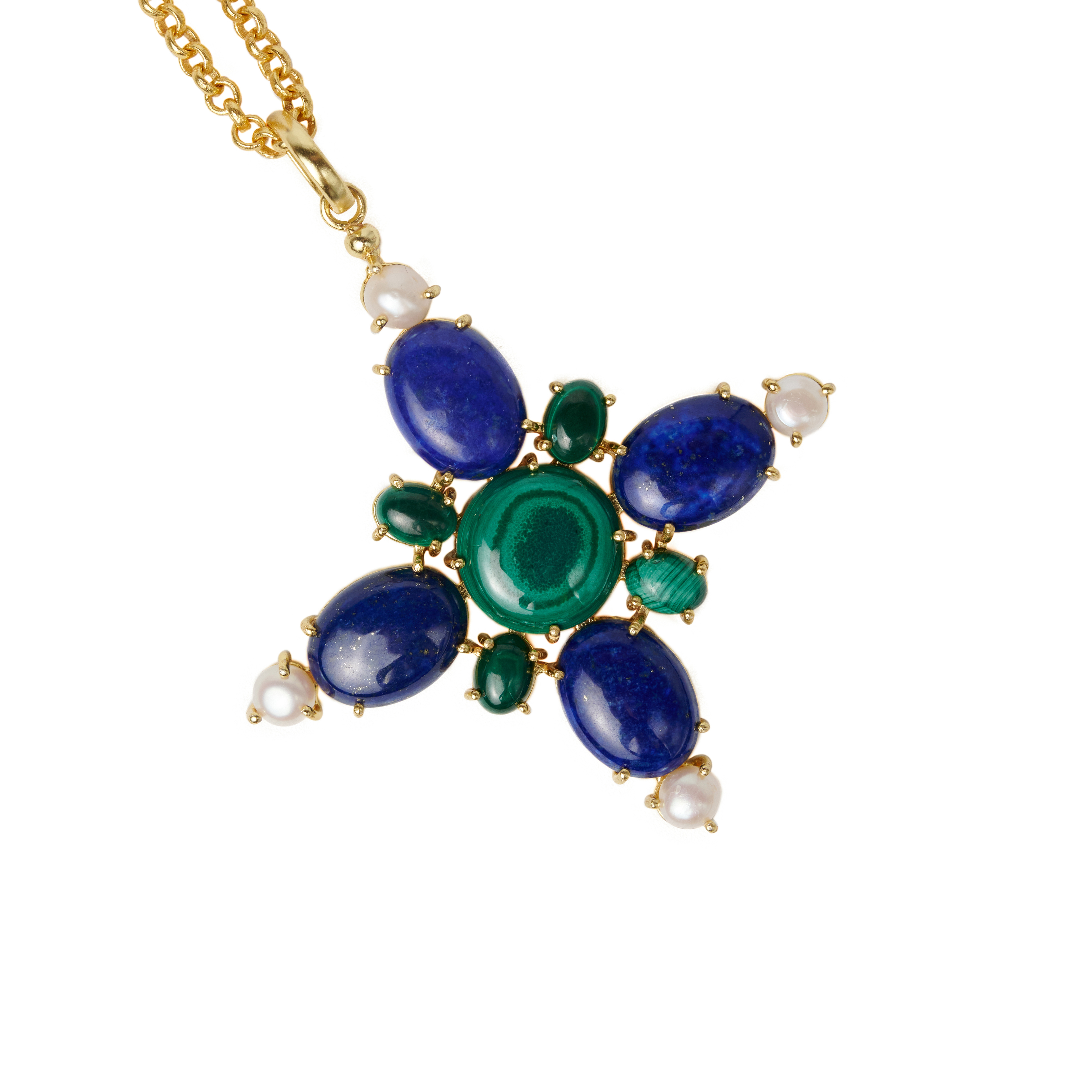 Lapis-lazuli and Malachite Pendant, four Cultured Pearls at the end of each side