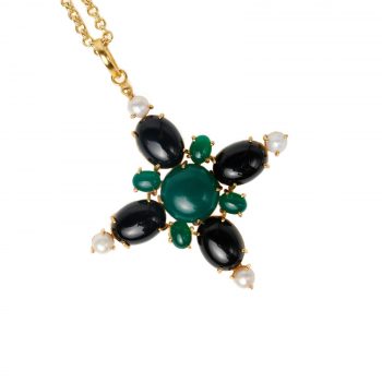 Black Onyx and Green Onyx Pendant, Four Cultured Pearls at the end of each side