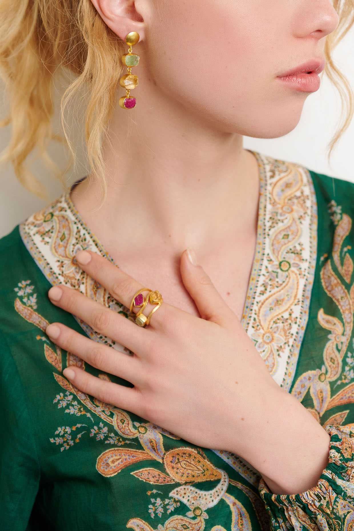 Rough stones combinations in a hand mounted designed ring and its matching pair of 3 stones earrings. Rings have adjustable size: 5 (50) to 6,5 (53).