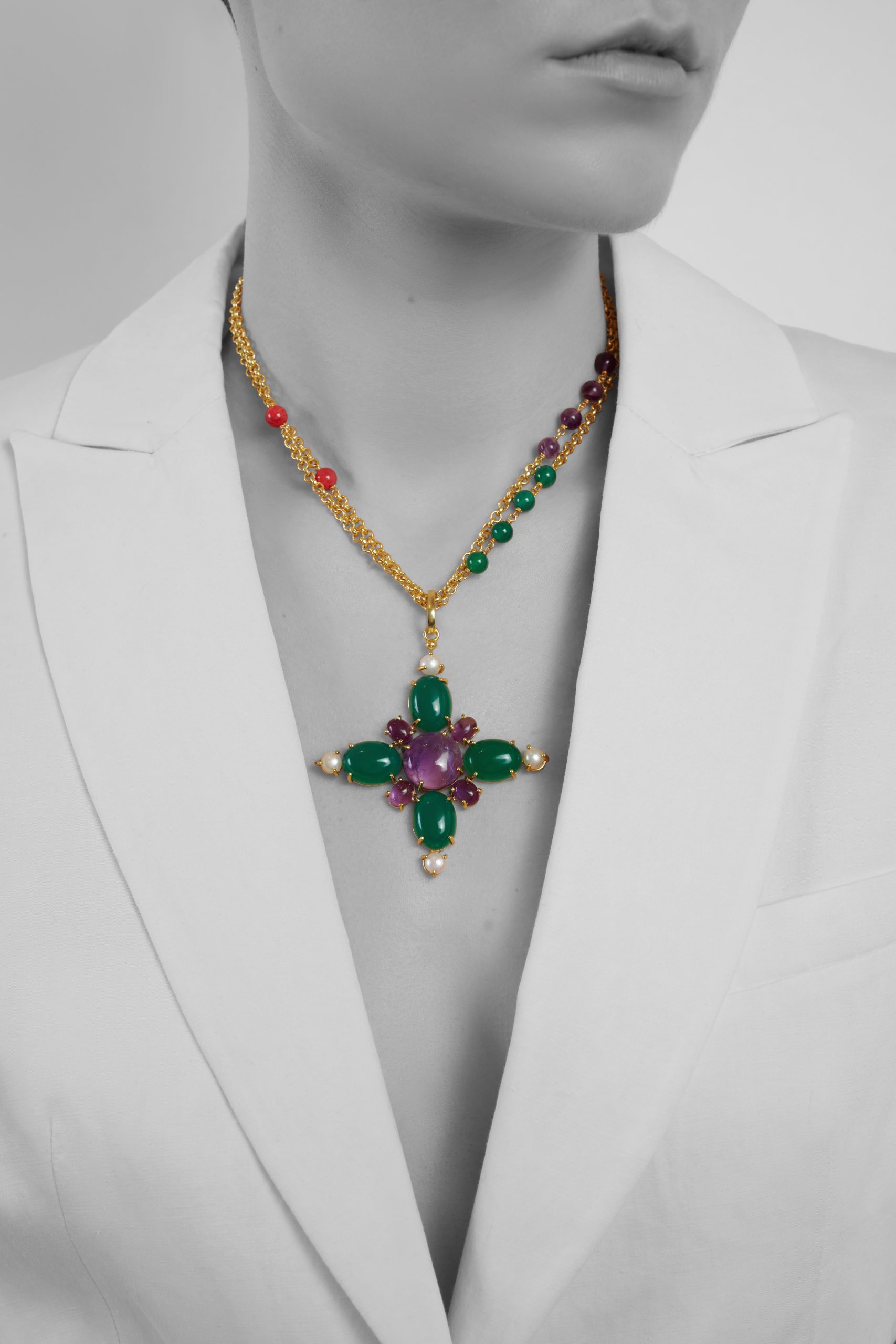 CROSSES WITH MATCHING CHAINS: Done with selected precious stones hand cut and polished for our design, and four cultured pearls at each side mounted on 24k gold-layered brass. Each piece is matched with a chain of 24k gold-layered brass with matching stones with a coral pearl at the end.