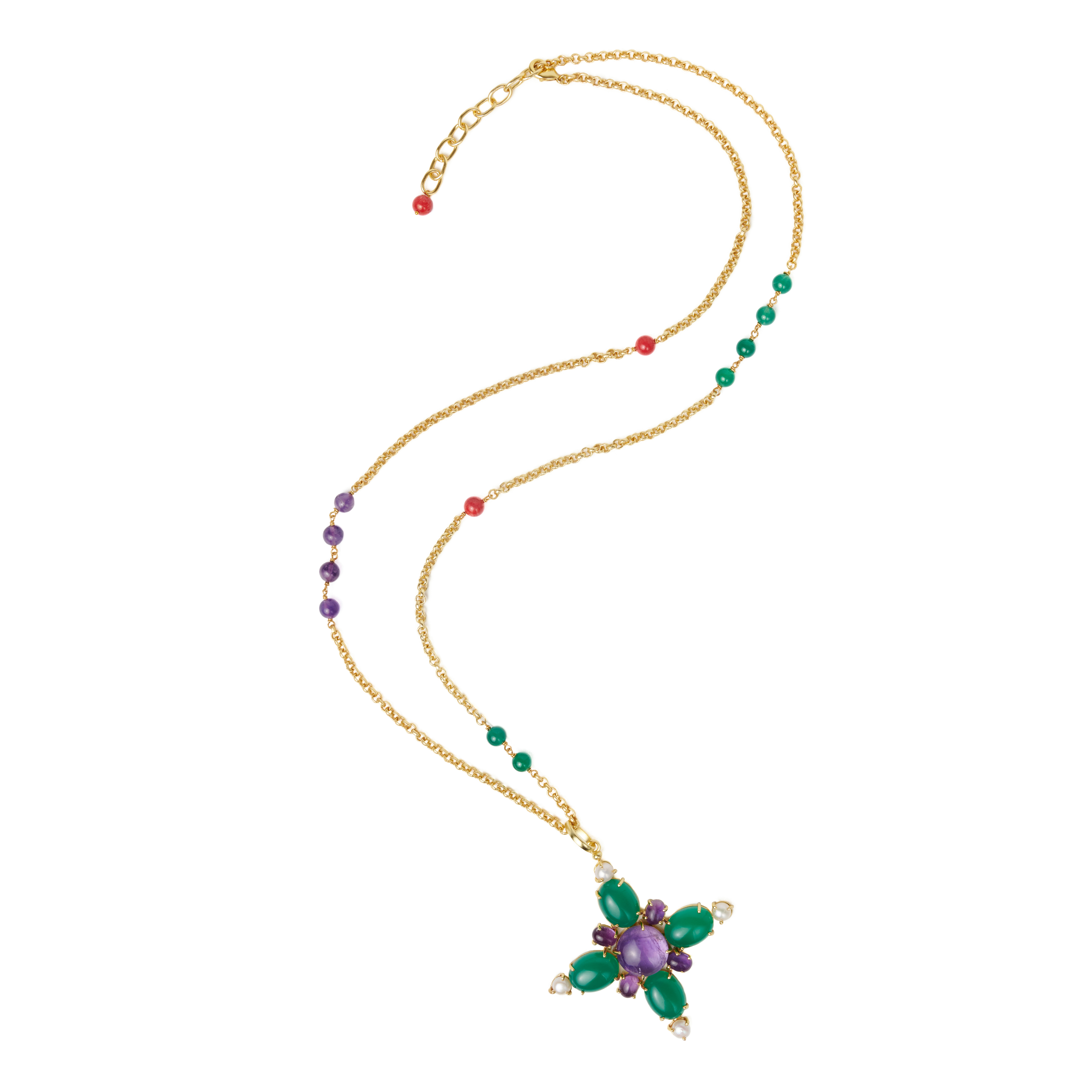 Complemented with its matching chain with green onyx and amethyst pearls and a coral end.
