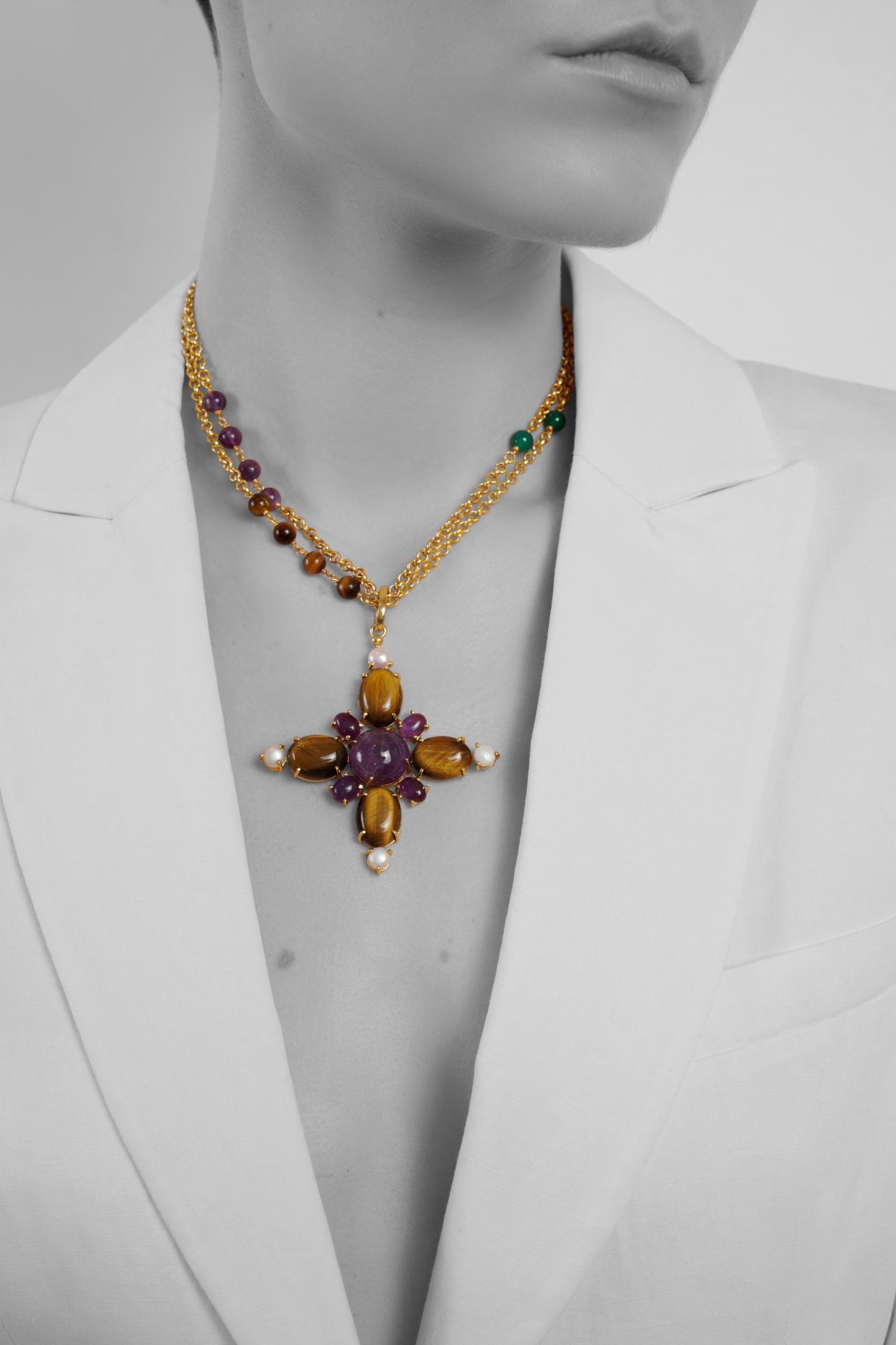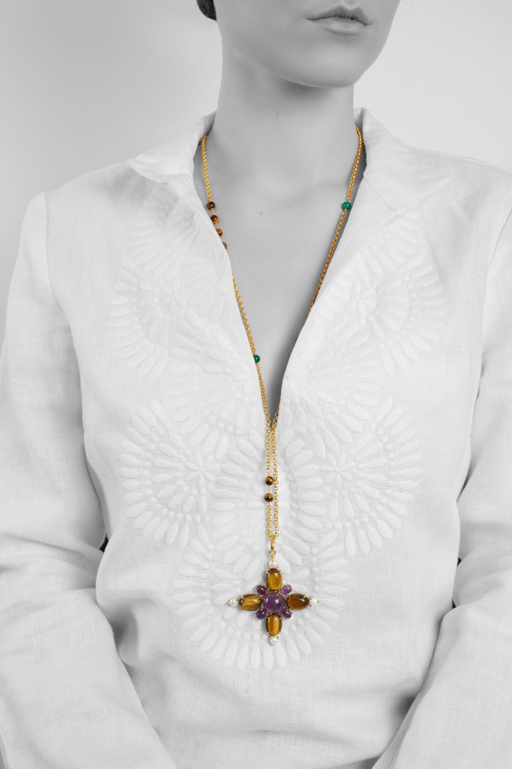CROSSES WITH MATCHING CHAINS: Done with selected precious stones hand cut and polished for our design, and four cultured pearls at each side mounted on 24k gold-layered brass. Each piece is matched with a chain of 24k gold-layered brass with matching stones with a coral pearl at the end.