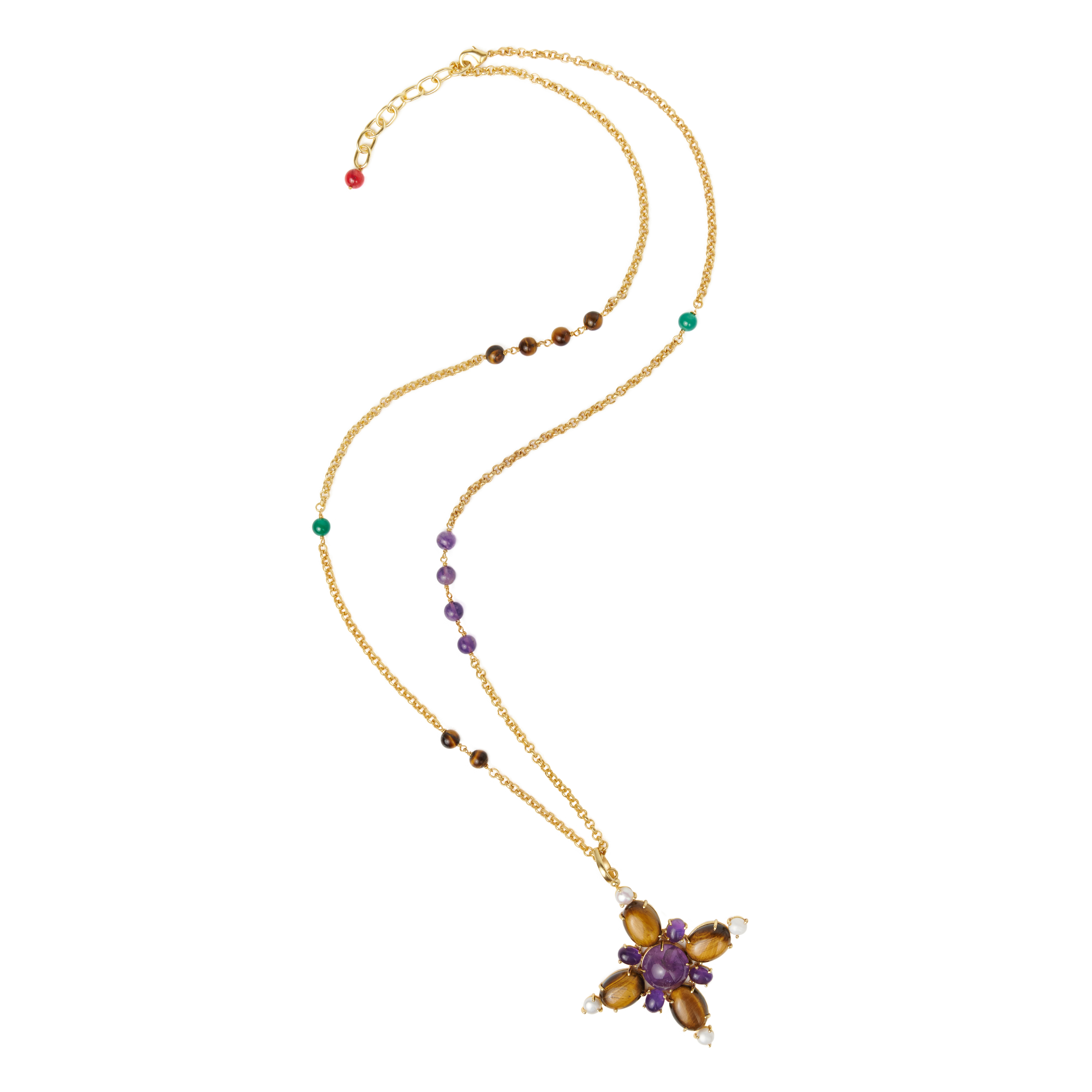 Complemented with its matching chain with tiger eye and amethyst pearls and a coral end.