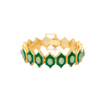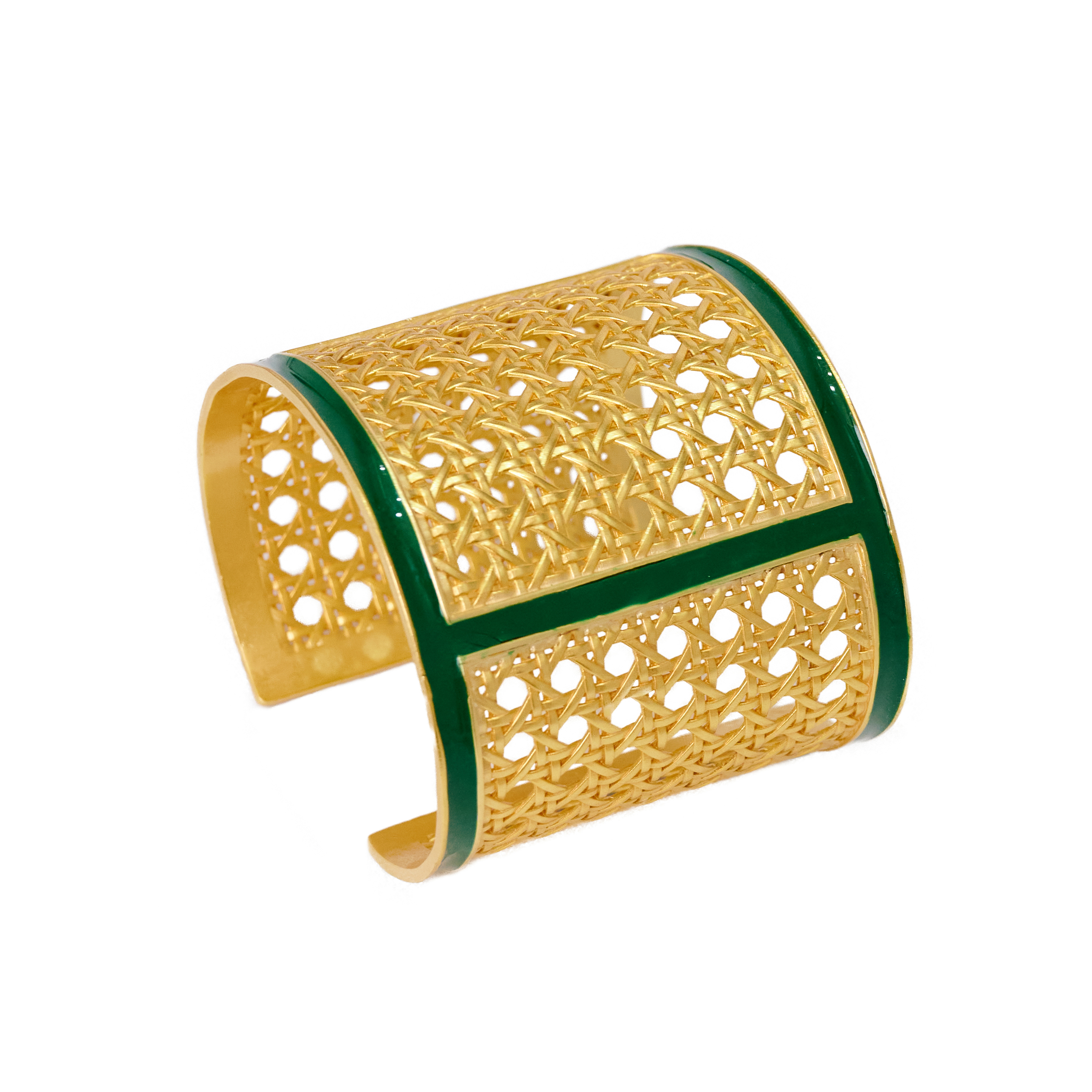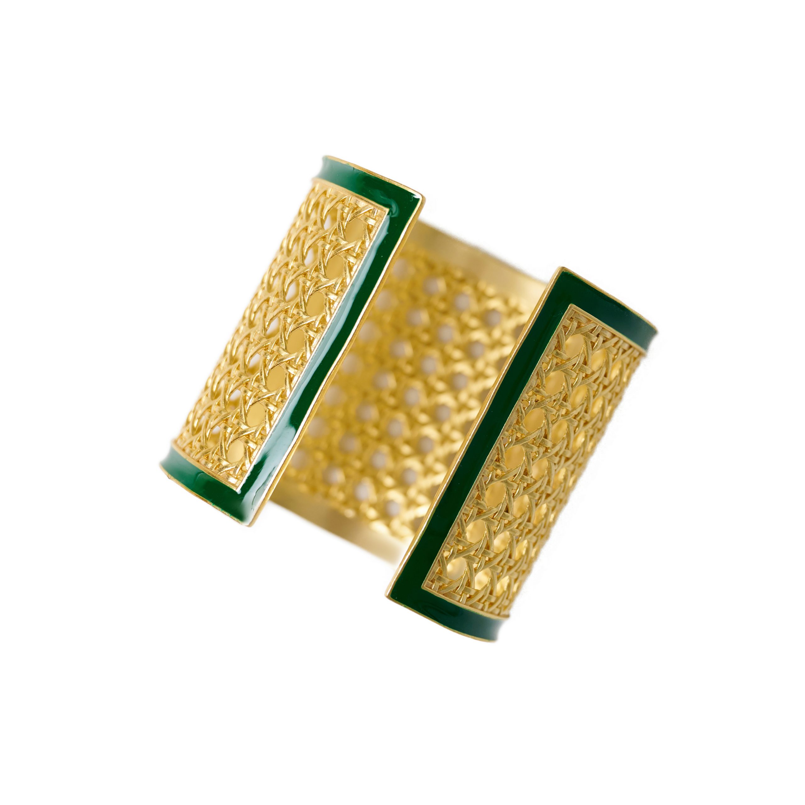 Structure on 24k gold layered brass classical caning, adorned with hand made green enamel.