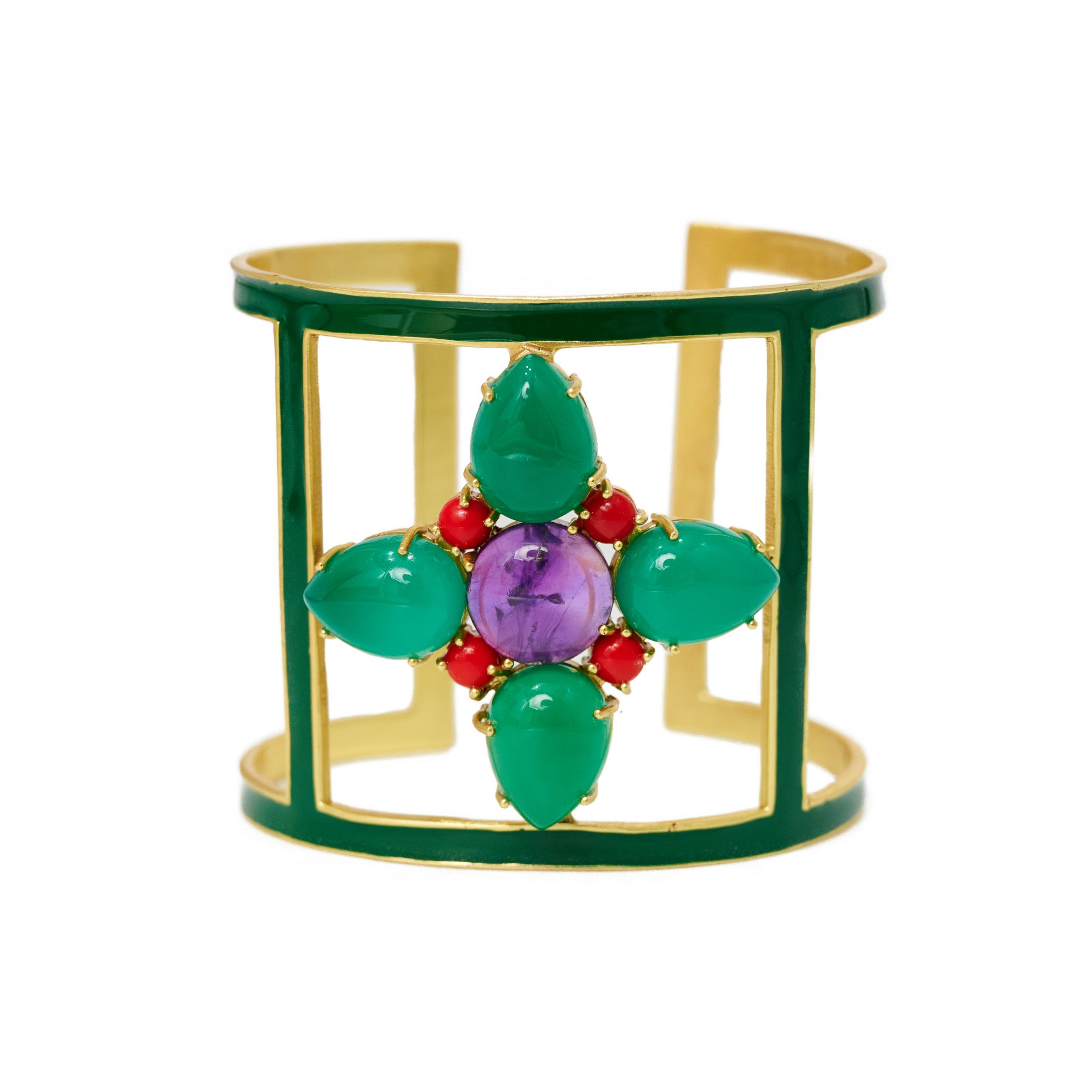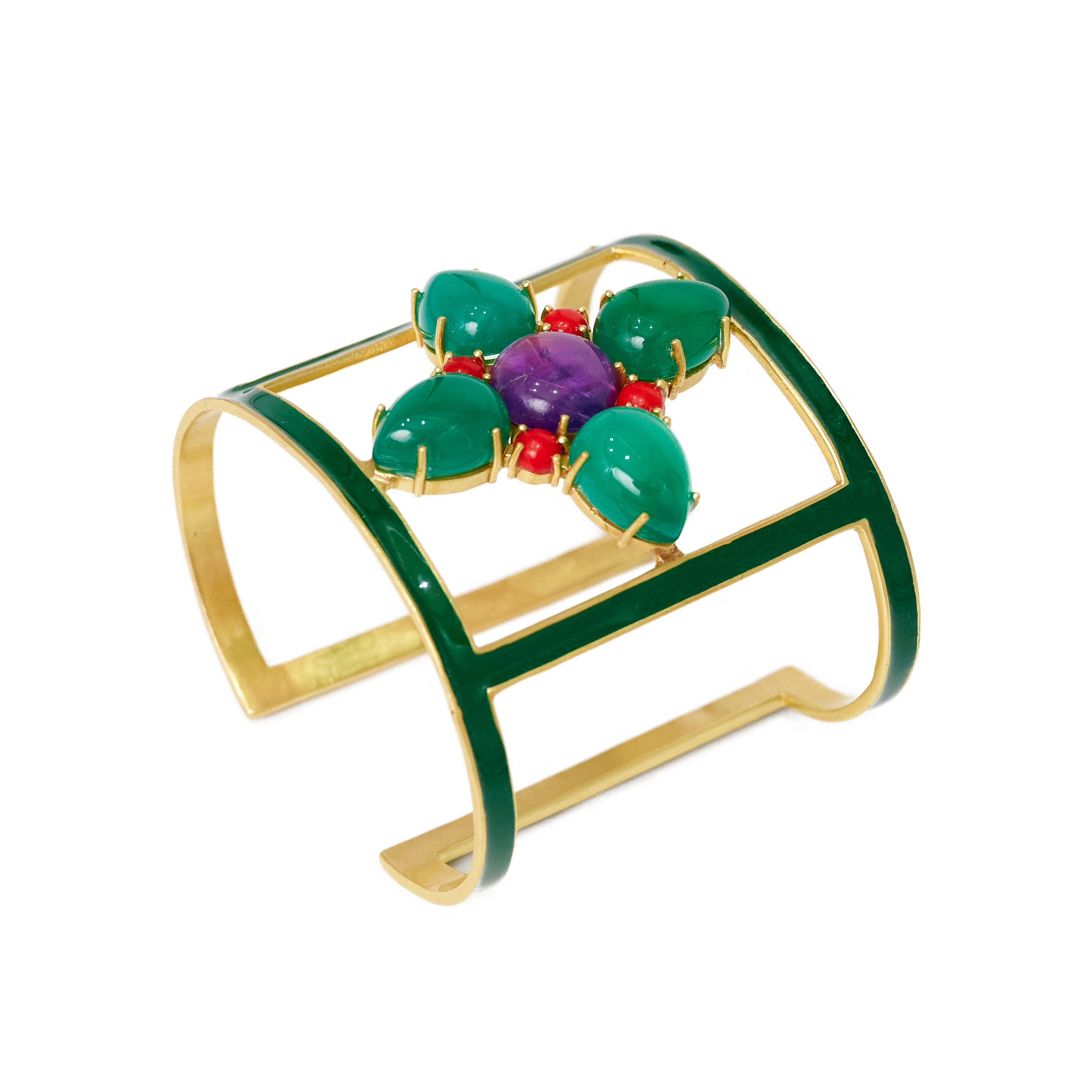 At its center, a flower with four petals of green onyx stones around an amethyst, accented by four reconstituted coral stones.