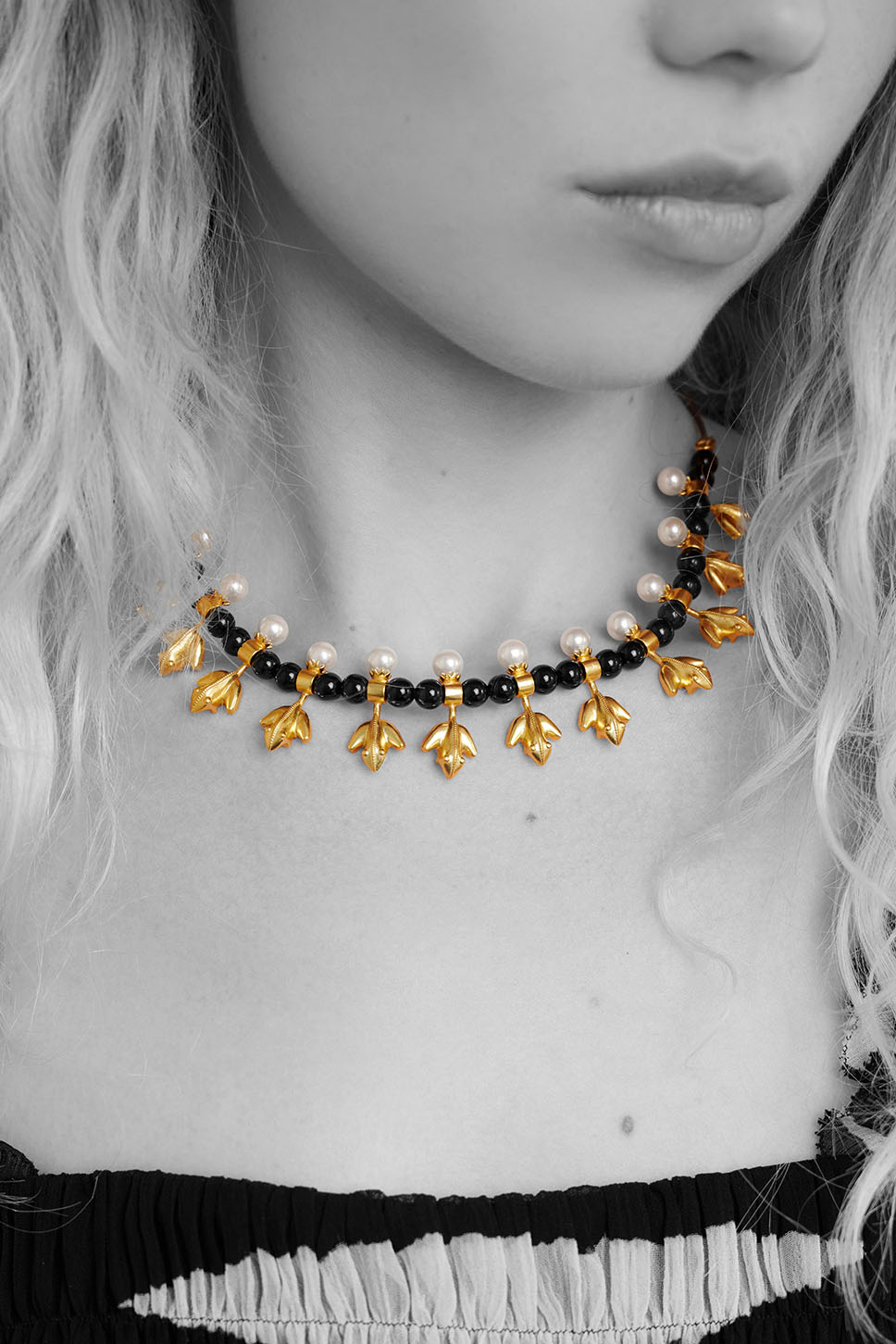 Beautiful piece of designed frogs done on 24k gold-layered brass each one with a shell pearl, and a couple of gems in between each frog. Mounted on half of a choker of 24k gold-layered brass.