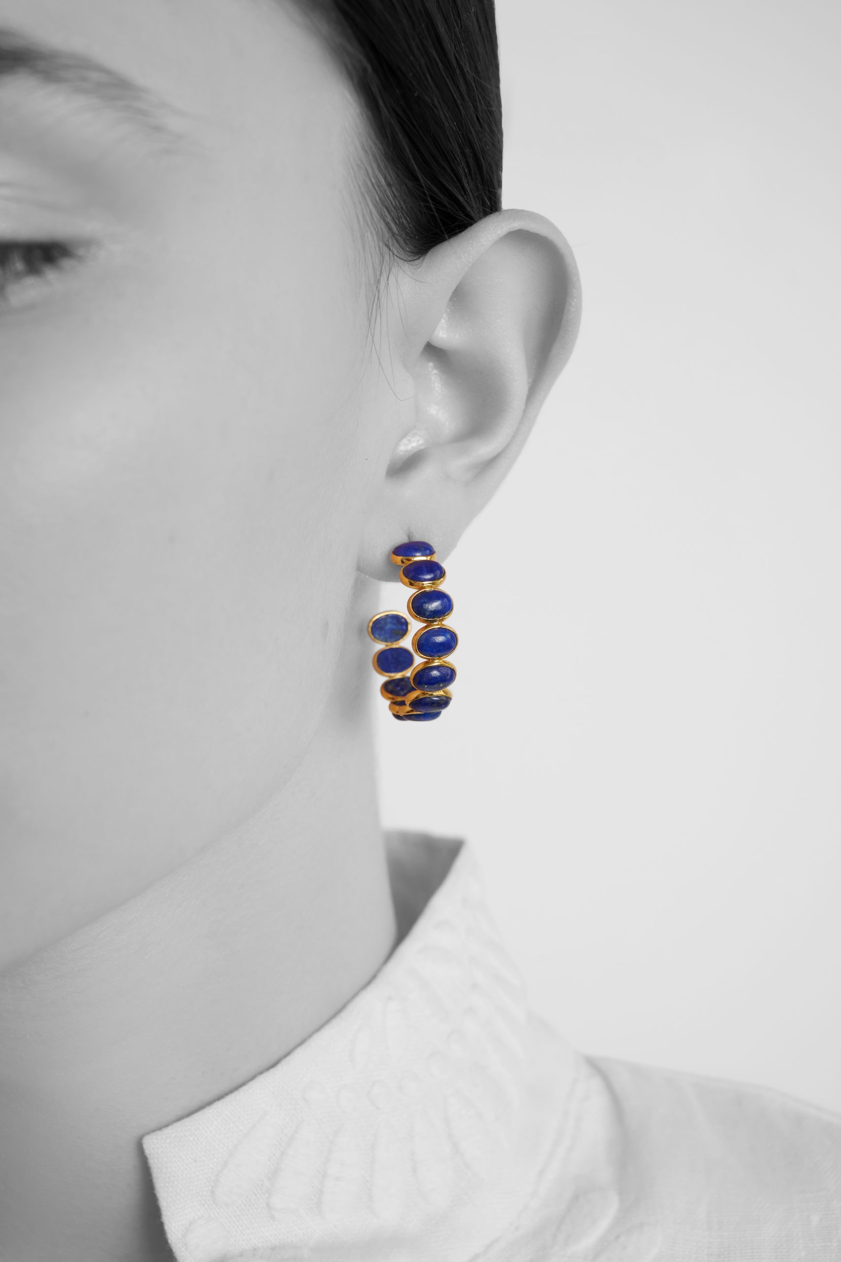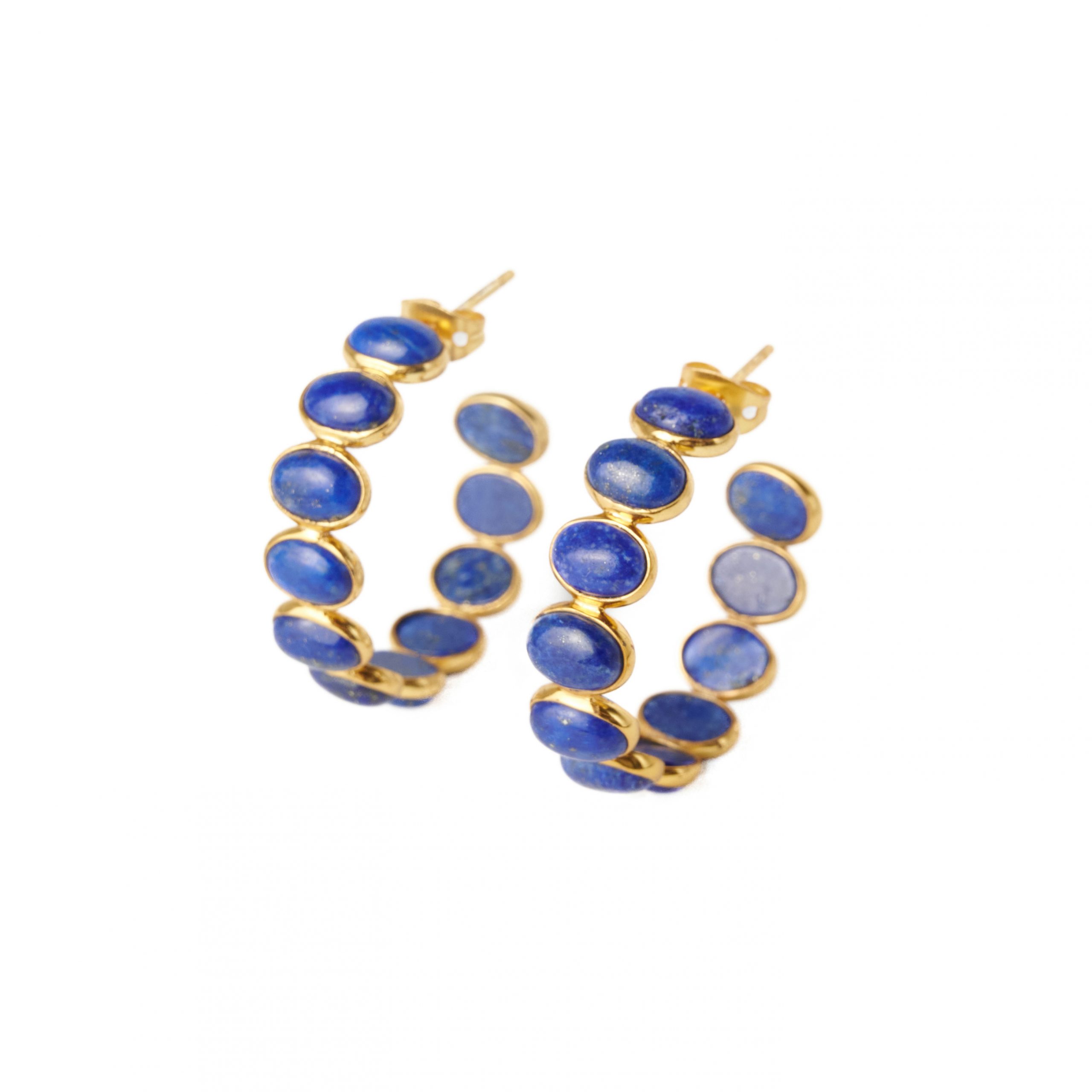 INFINITY CABOCHON HOOPS: Hand carved and polished 11 cabochon stones for each side, hand mounted one by one to create a hoop on 18k gold-layered brass. Passing closing.