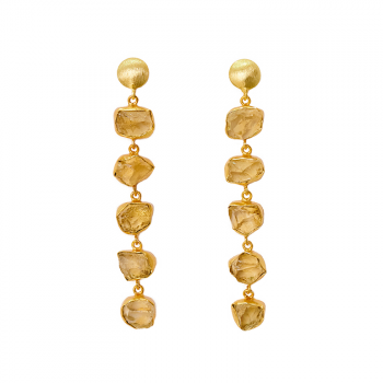 PENDIENTES: Piezas colgantes con una serie de piedras coloridas, de aspecto natural e irregulares, engastadas en latón chapado en oro de 18 quilates. El diseño comienza con un perno redondo chapado en oro cepillado en la parte superior, que fija los pendientes a la oreja. Cada piedra tiene un acabado rugoso y sin pulir, lo que les confiere un encanto natural y natural. Estos pendientes evocan un estilo bohemio y ecléctico.