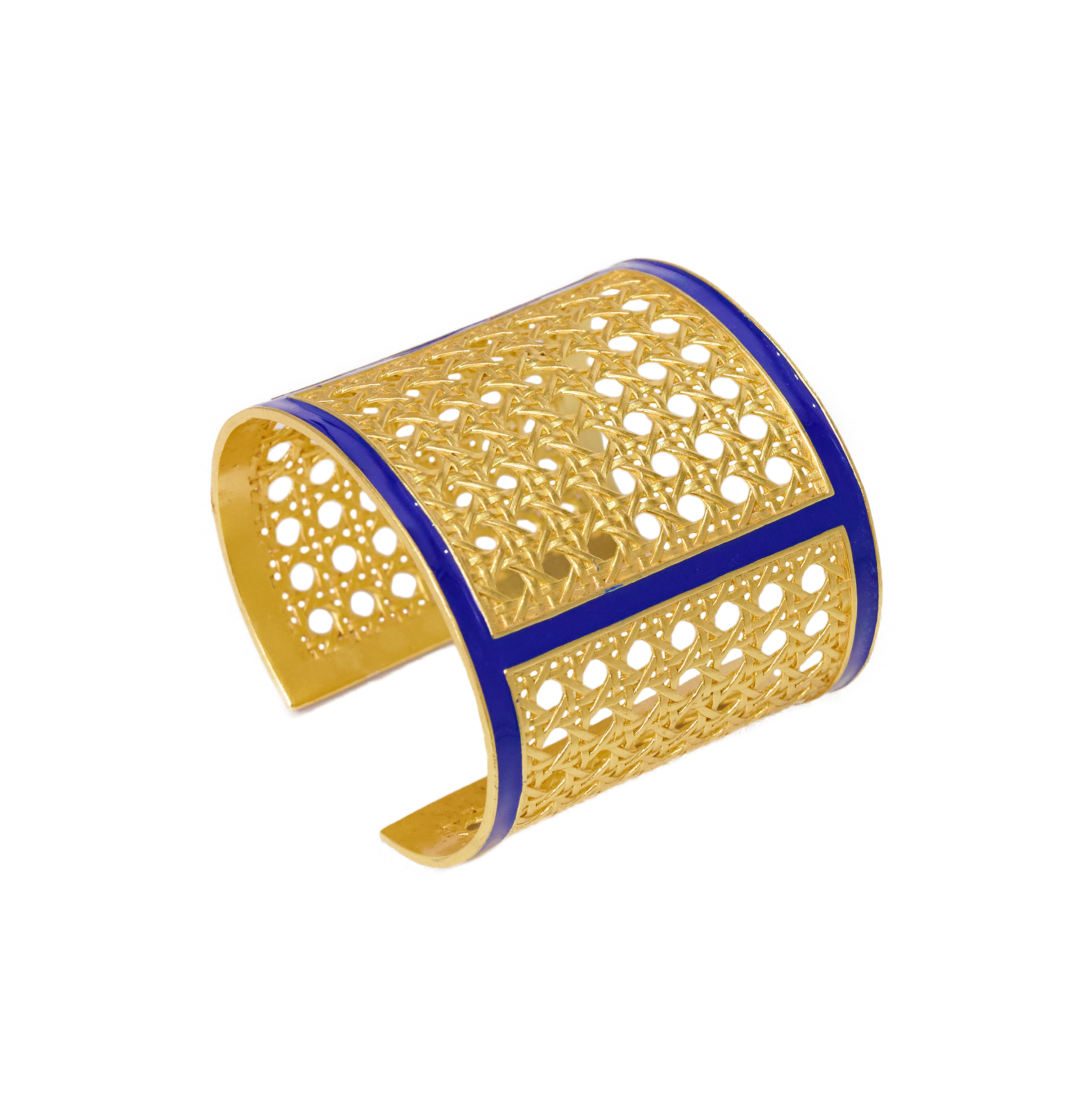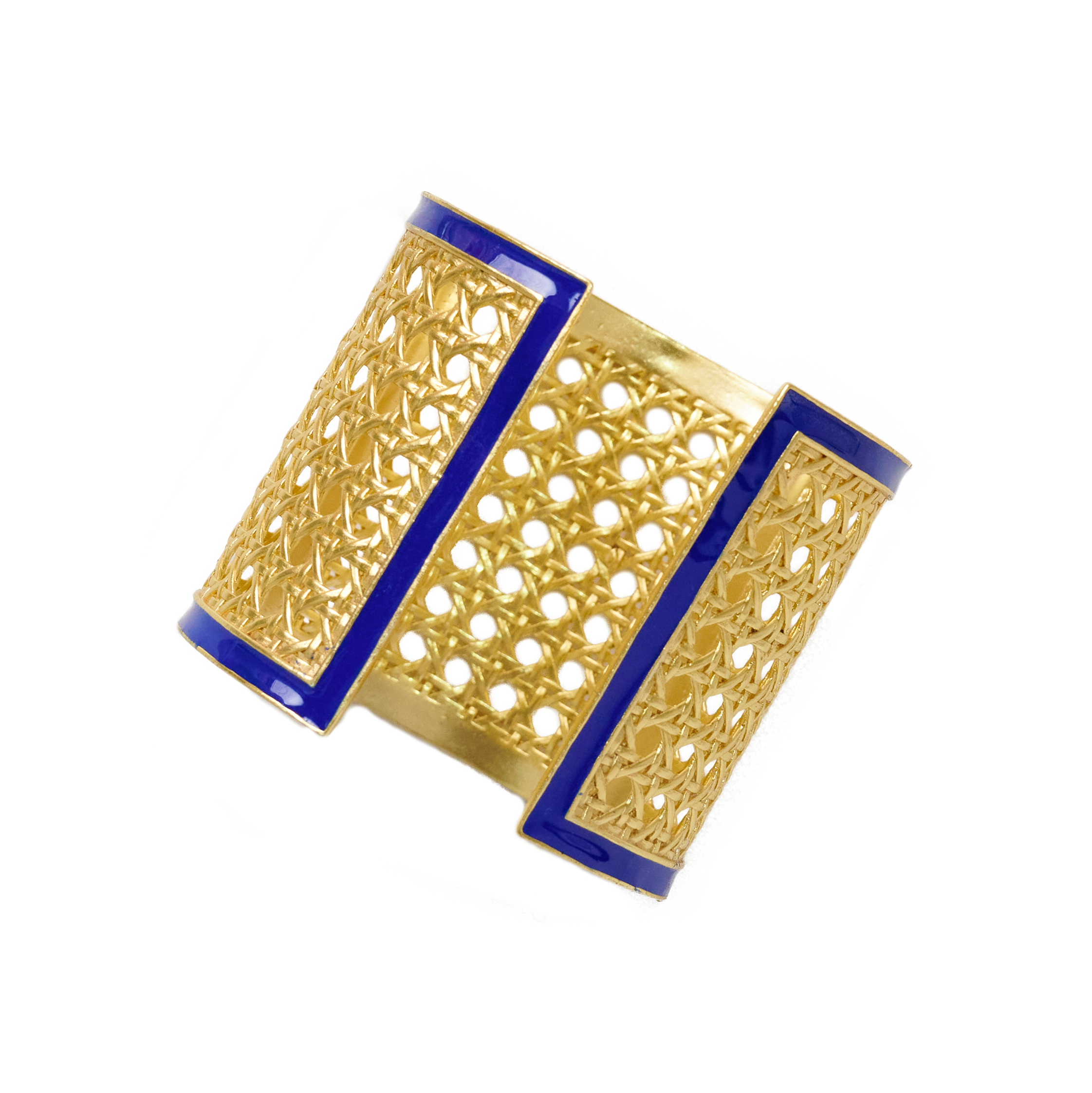 Structure on 24k gold layered brass classical caning, adorned with hand made royal blue enamel.