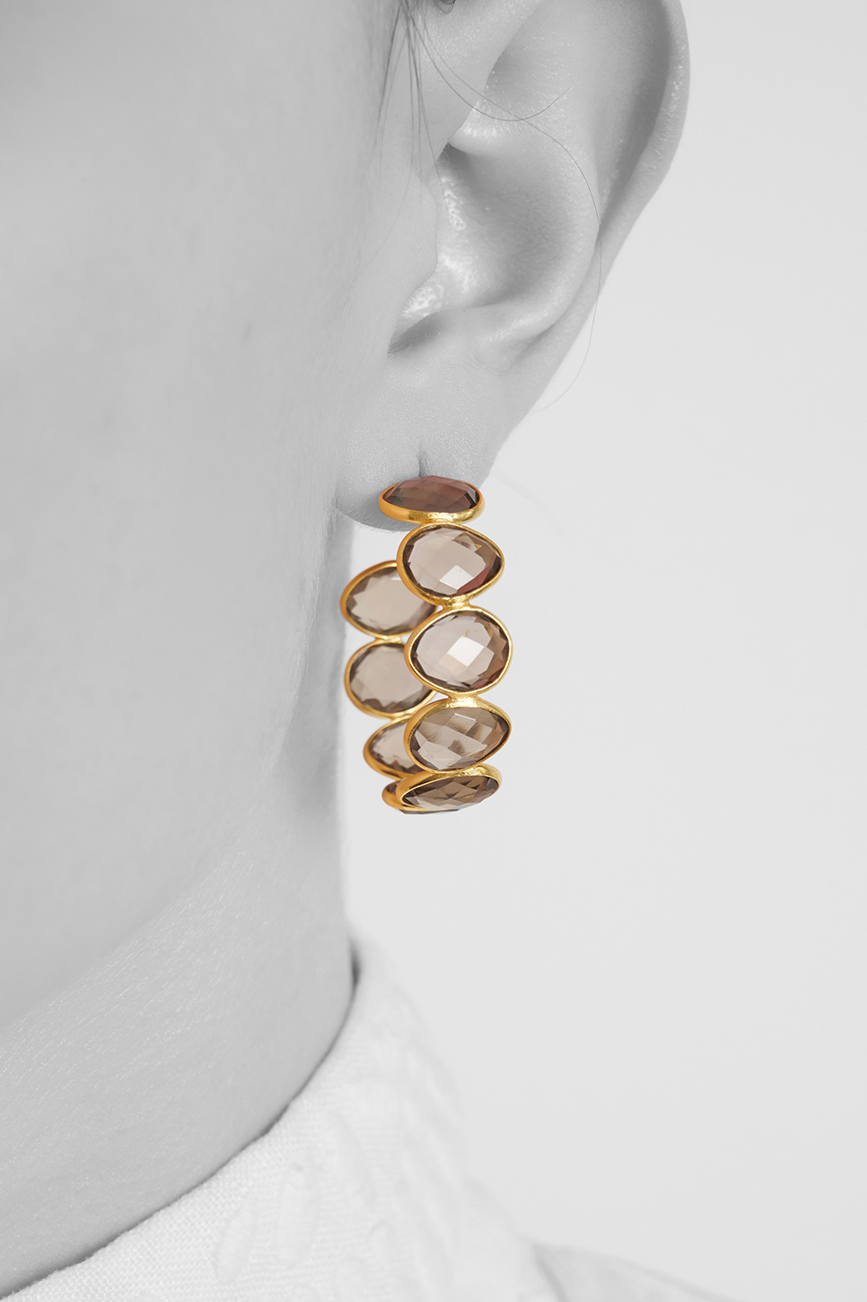 AROS FACETADOS INFINITO: 9 piedras ahumadas talladas y facetadas a mano, montadas a mano una a una para crear un aro en latón recubierto de oro de 18k.