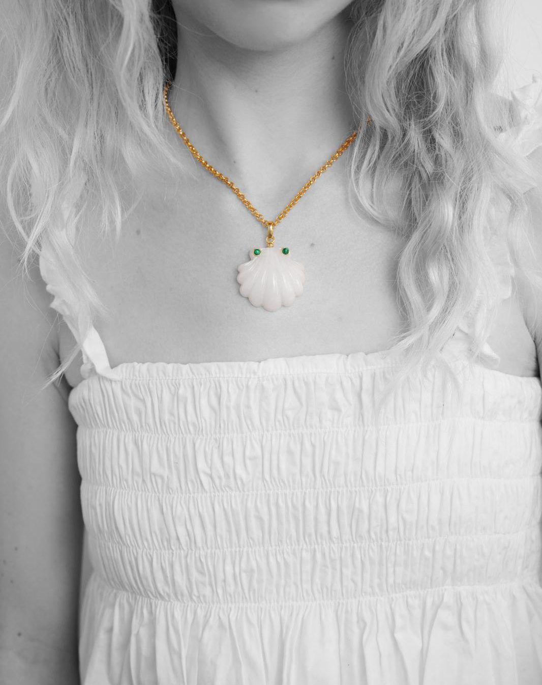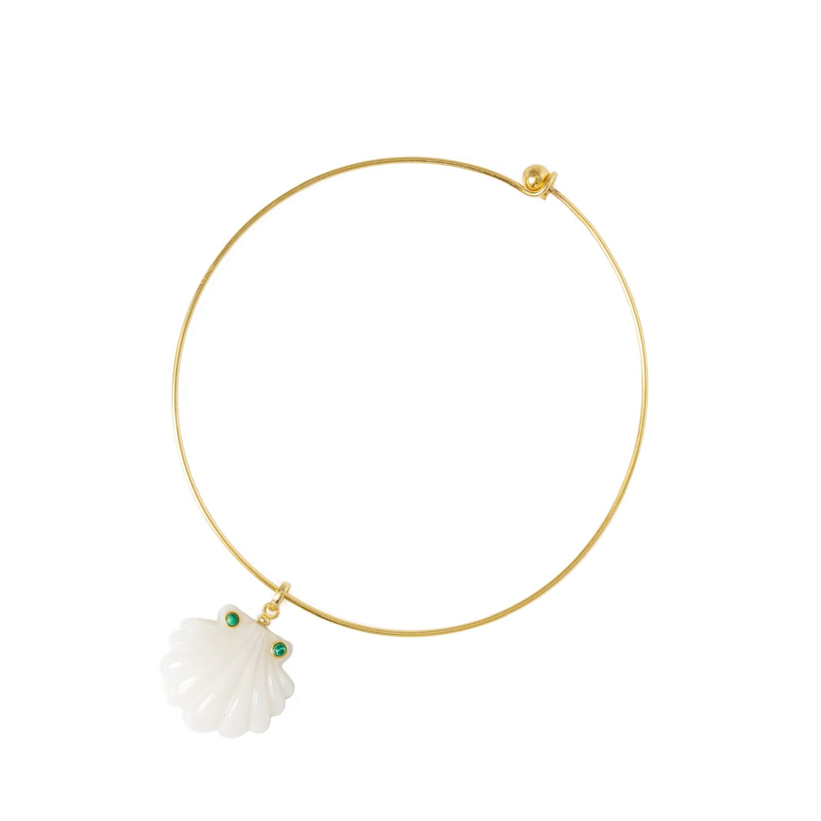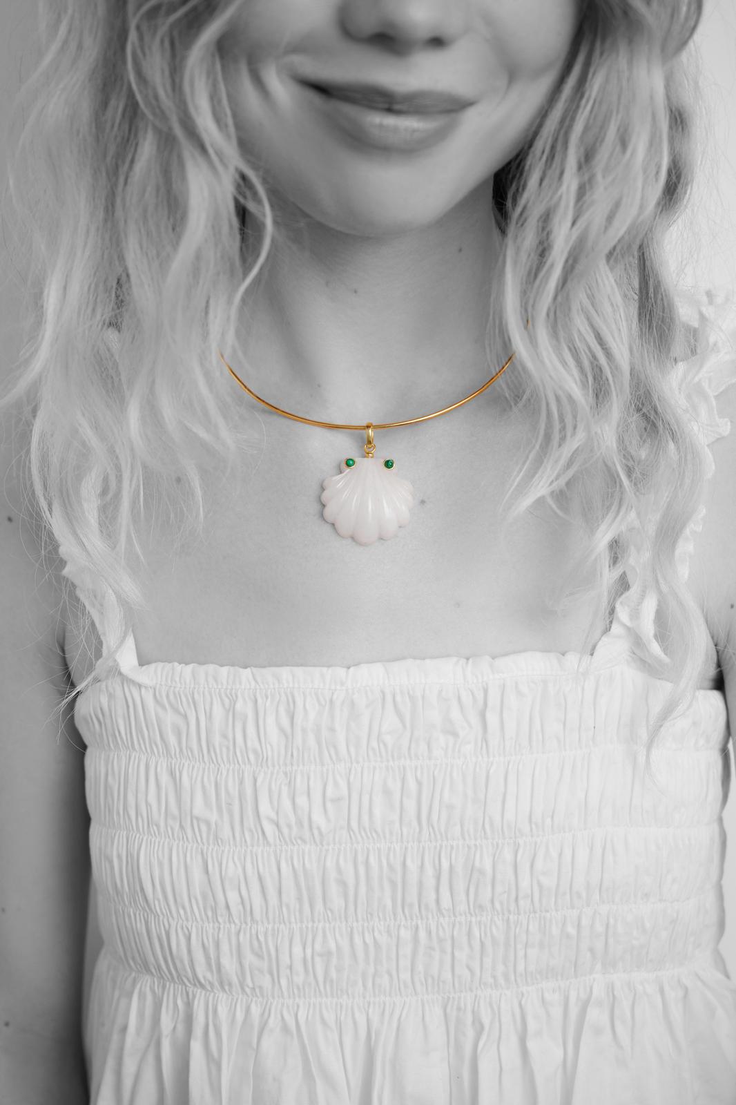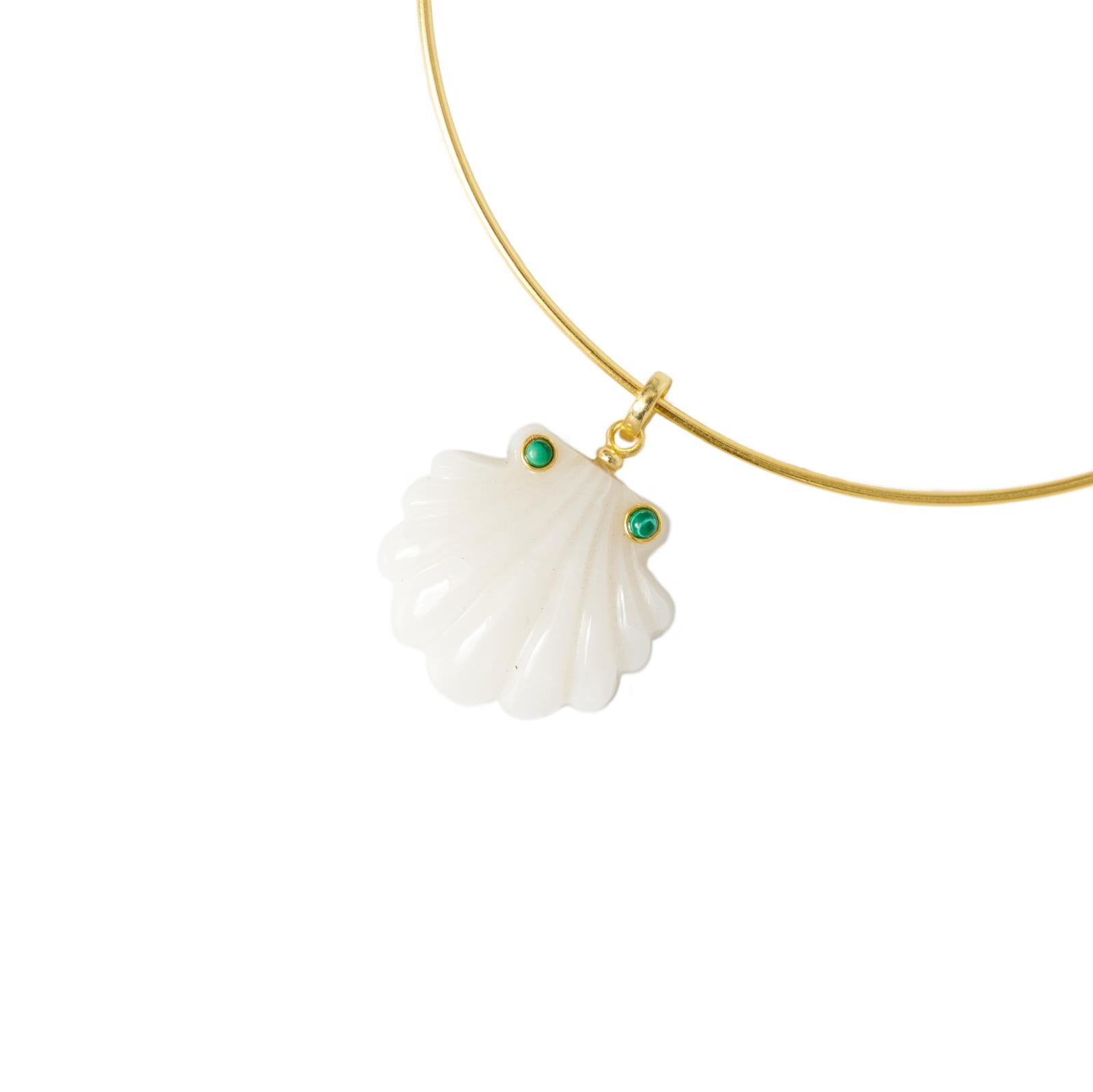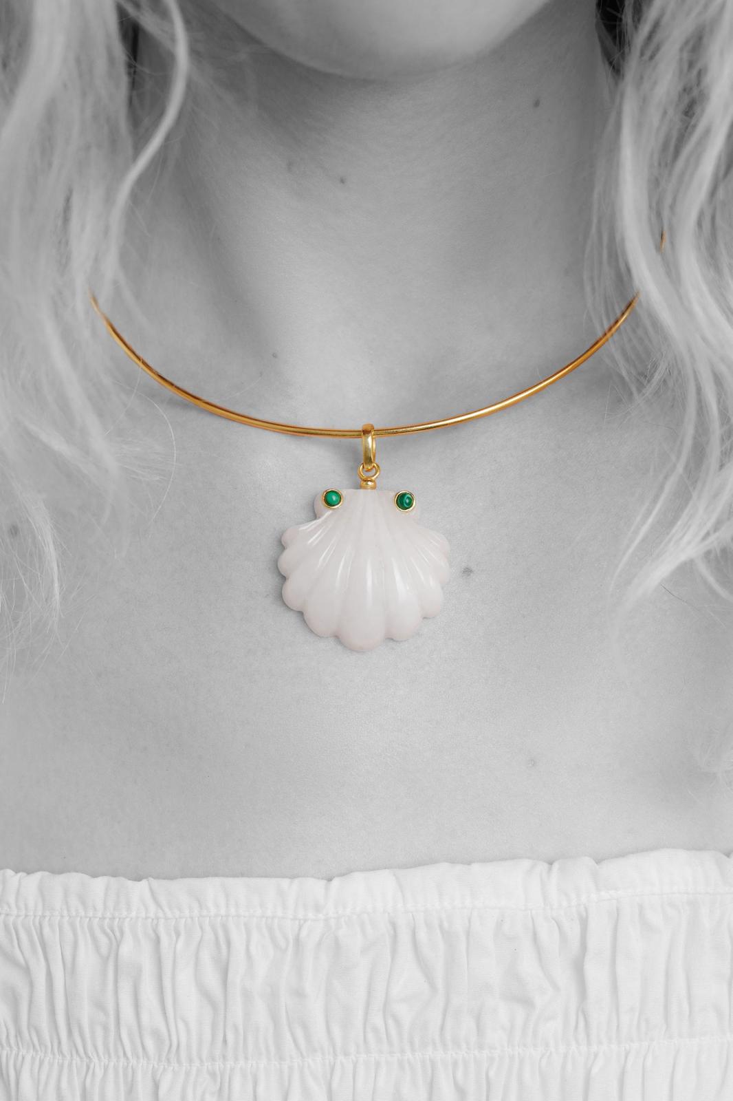 White quartz hand carved shell pendant with two turquoise stones on a choker or a chain